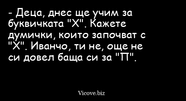 - Деца, днес ще учим за буквичката "Х". Кажете думички, които започват с "Х". Иванчо, ти не, още не си довел баща си за "П".