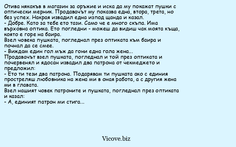 Отива някакъв в магазин за оръжие и иска да му покажат пушки с оптически мерник. Продавачът му показва една, втора, трета, но без успех. Накрая извадил една изпод щанда и казал.