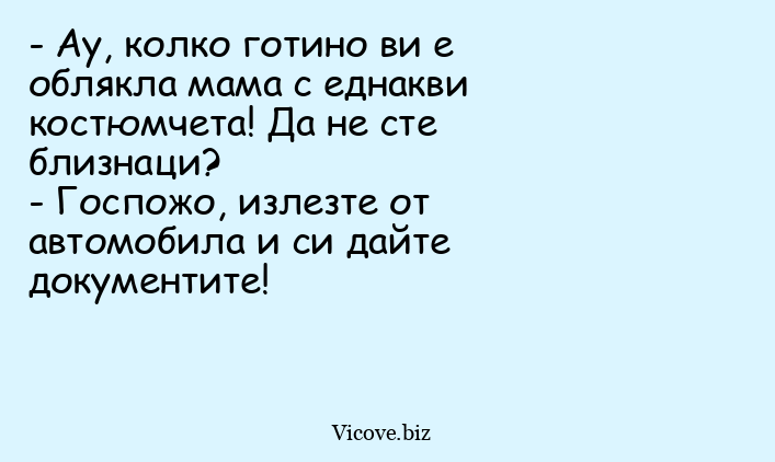 - Ау, колко готино ви е облякла мама с еднакви костюмчета! Да не сте близнаци?