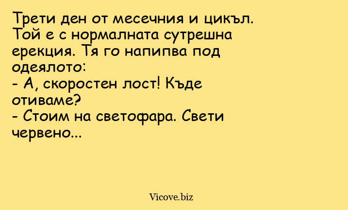 Трети ден от месечния и цикъл. Той е с нормалната сутрешна ерекция. Тя го напипва под одеялото: