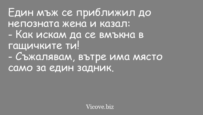 Момче и момиче се разхождат в парка. Няма откъде да си купят сладолед, няма кафе, няма нищо... Гледат табела: "Плюенето забранено! Глоба 10 лева". Момчето казва: