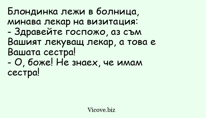 - Здравейте госпожо, аз съм Вашият лекуващ лекар, а това е Вашата сестра!