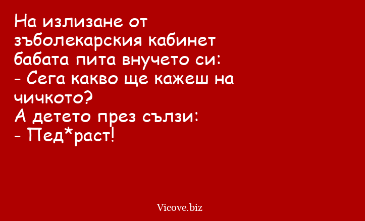 На излизане от зъболекарския кабинет бабата пита внучето си: