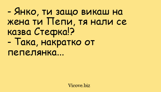 - Янко, ти защо викаш на жена ти Пепи, тя нали се казва Стефка!?
