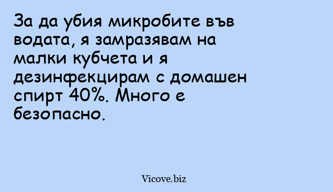 За да убия микробите във водата, я замразявам на малки кубчета и я дезинфекцирам с домашен спирт 40%. Много е безопасно.