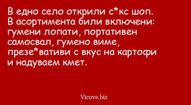 В едно село открили с*кс шоп. В асортимента били включени: гумени лопати, портативен самосвал, гумено виме, презе*вативи с вкус на картофи и надуваем кмет.