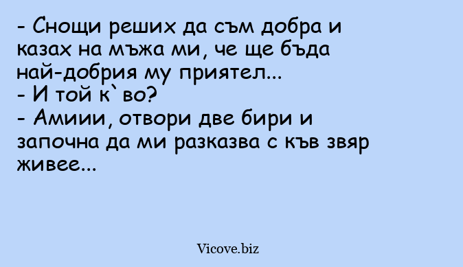 - Снощи реших да съм добра и казах на мъжа ми, че ще бъда най-добрия му приятел...