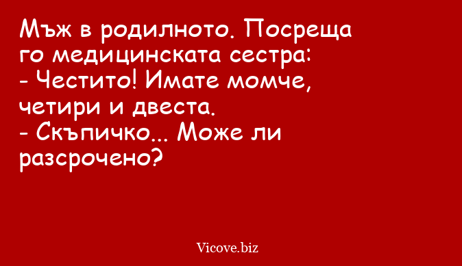 - Комши, идвай бързо, ще черпя! Роди ми се син!