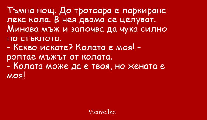 - Какво искате? Колата е моя! - роптае мъжът от колата.