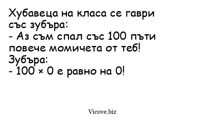 Две абитуриентки се събуждат сутринта след як купон. Гледат в стаята седи един пич и си пуши. Едната казва на другата: