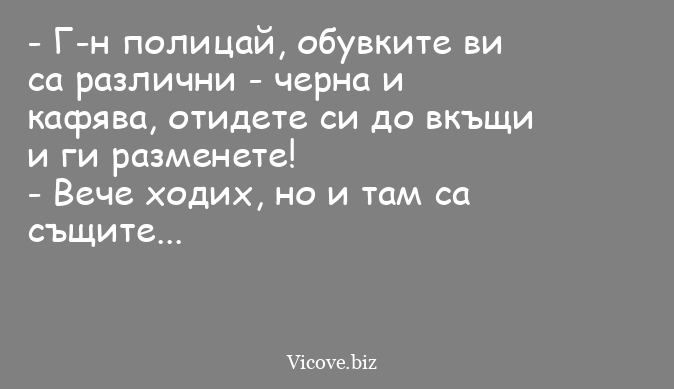 - Г-н полицай, обувките ви са различни - черна и кафява, отидете си до вкъщи и ги разменете!