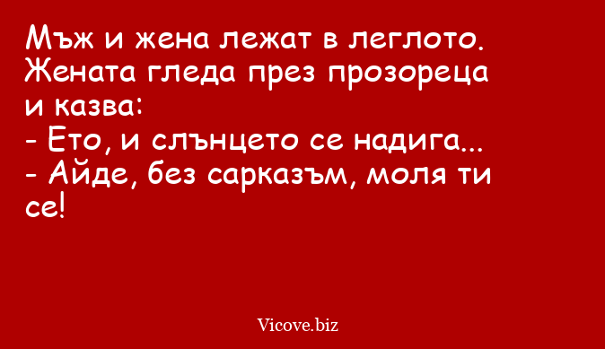 Мъж и жена лежат в леглото. Жената гледа през прозореца и казва: