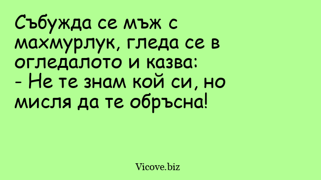 Събужда се мъж с махмурлук, гледа се в огледалото и казва: