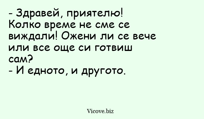 - Здравей, приятелю! Колко време не сме се виждали! Ожени ли се вече или все още си готвиш сам?