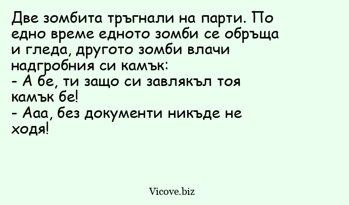 Две зомбита тръгнали на парти. По едно време едното зомби се обръща и гледа, другото зомби влачи надгробния си камък: