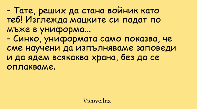 - Тате, реших да стана войник като теб! Изглежда мацките си падат по мъже в униформа...