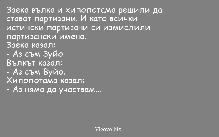 Заека вълка и хипопотама решили да стават партизани. И като всички истински партизани си измислили партизански имена.