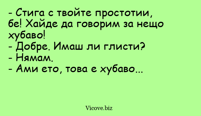 - Стига с твойте простотии, бе! Хайде да говорим за нещо хубаво!