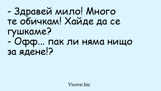 Момче и момиче се разхождат в парка. Няма откъде да си купят сладолед, няма кафе, няма нищо... Гледат табела: "Плюенето забранено! Глоба 10 лева". Момчето казва: