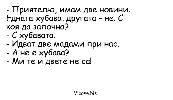 - Приятелю, имам две новини. Едната хубава, другата - не. С коя да започна?