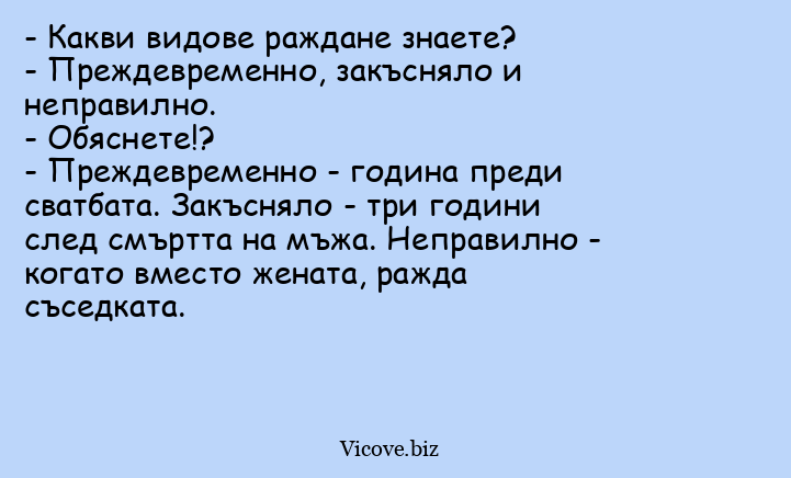 - Преждевременно - година преди сватбата. Закъсняло - три години след смъртта на мъжа. Неправилно - когато вместо жената, ражда съседката.