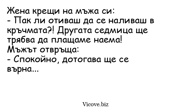 - Пак ли отиваш да се наливаш в кръчмата?! Другата седмица ще трябва да плащаме наема!