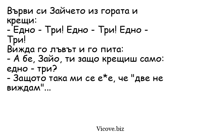 - А бе, Зайо, ти защо крещиш само: едно - три?