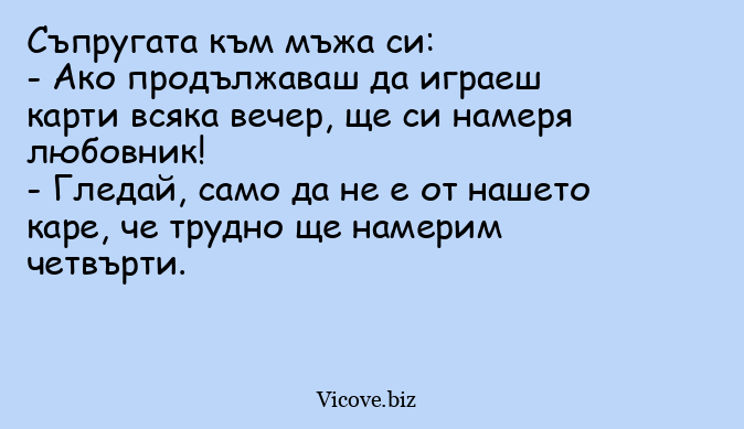 - Ако продължаваш да играеш карти всяка вечер, ще си намеря любовник!
