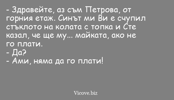 - Здравейте, аз съм Петрова, от горния етаж. Синът ми Ви е счупил стъклото на колата с топка и Сте казал, че ще му... майката, ако не го плати.