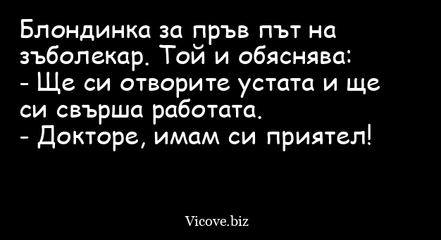 Блондинка за пръв път на зъболекар. Той и обяснява:
