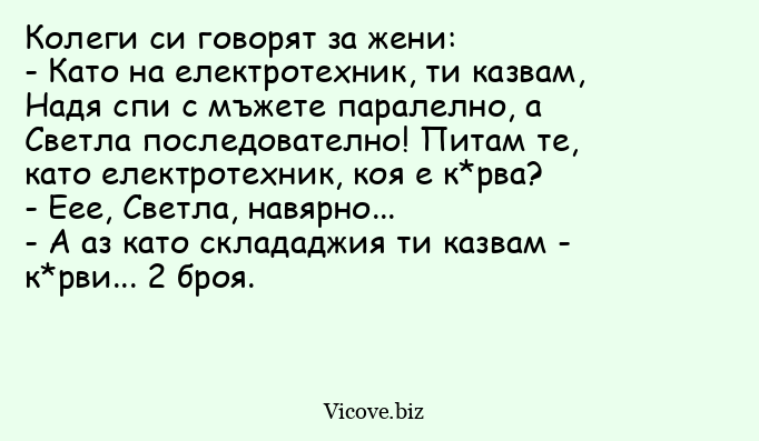 - Като на електротехник, ти казвам, Надя спи с мъжете паралелно, а Светла последователно! Питам те, като електротехник, коя е к*рва?