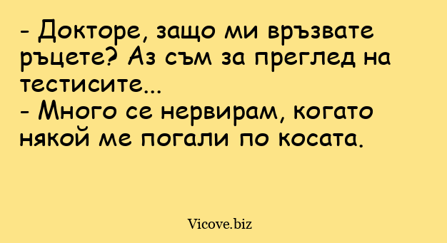 - Докторе, защо ми връзвате ръцете? Аз съм за преглед на тестисите...