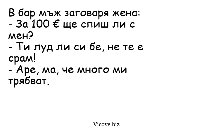 Красива жена стои сама на бара и при нея идва нахален младеж и я заговара: