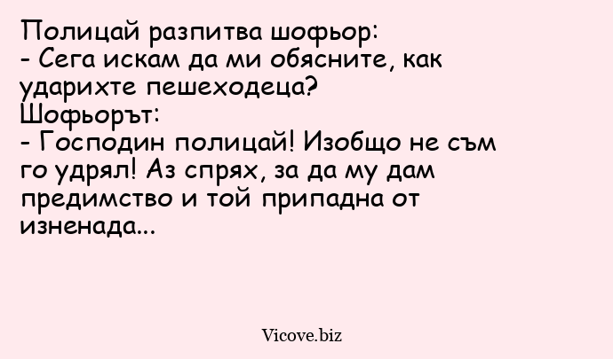 - Господин полицай! Изобщо не съм го удрял! Аз спрях, за да му дам предимство и той припадна от изненада...