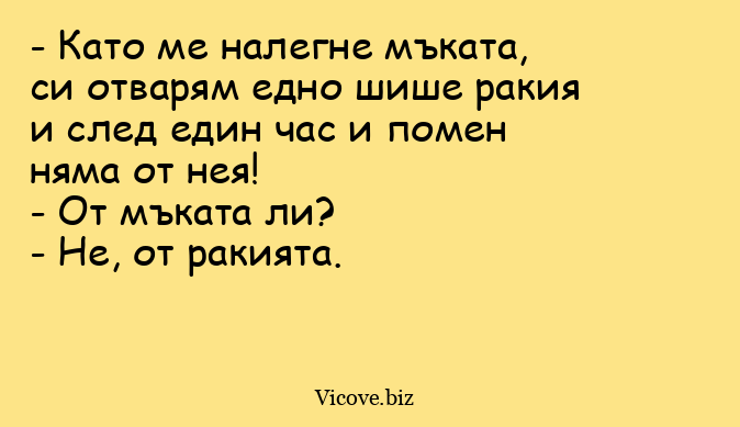 - Като ме налегне мъката, си отварям едно шише ракия и след един час и помен няма от нея!