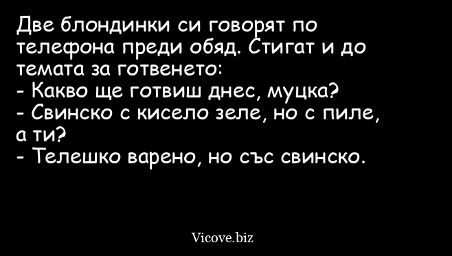 Две блондинки си говорят по телефона преди обяд. Стигат и до темата за готвенето: