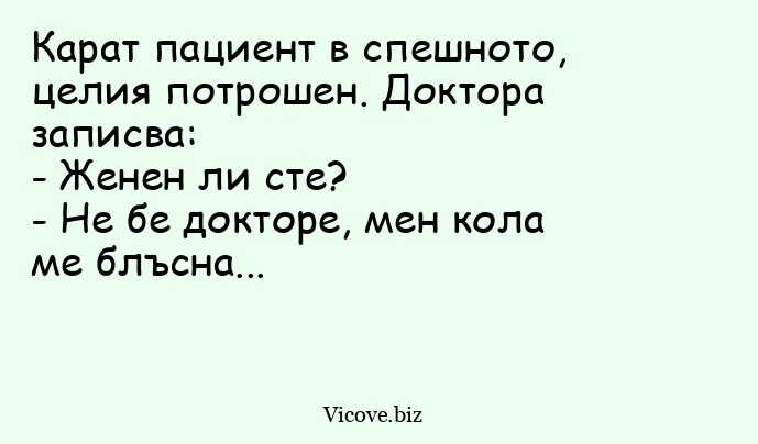 Карат пациент в спешното, целия потрошен. Доктора записва: