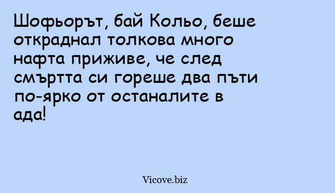 Шофьорът, бай Кольо, беше откраднал толкова много нафта приживе, че след смъртта си гореше два пъти по-ярко от останалите в ада!