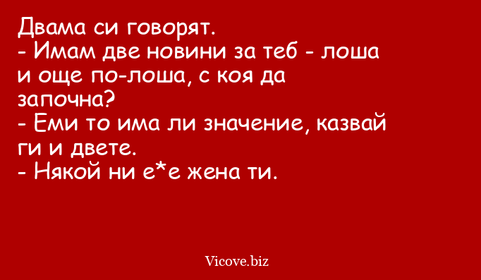 Двама си говорят. - Имам две новини...