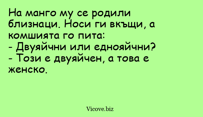 На манго му се родили близнаци. Носи ги вкъщи, а комшията го пита: