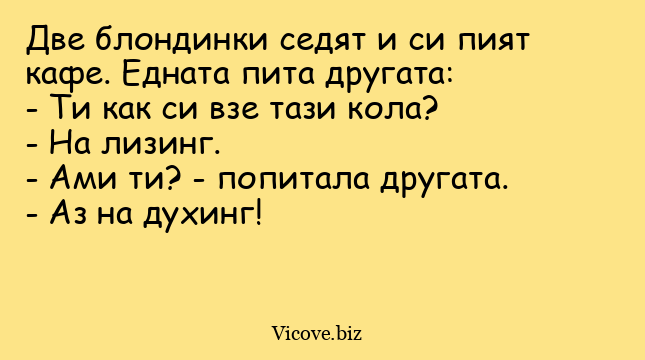 Две блондинки седят и си пият кафе. Едната пита другата: