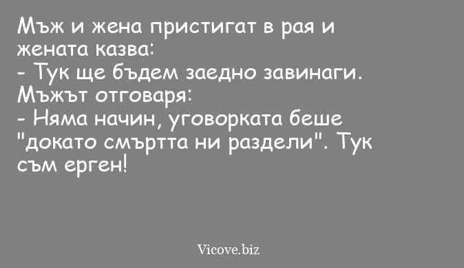 - Няма начин, уговорката беше "докато смъртта ни раздели". Тук съм ерген!