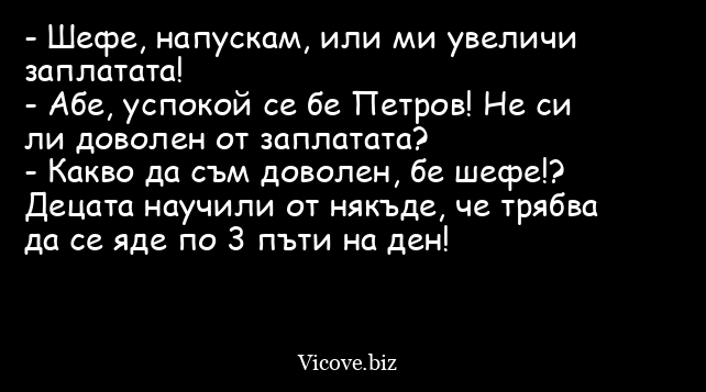 - Абе, успокой се бе Петров! Не си ли доволен от заплатата?