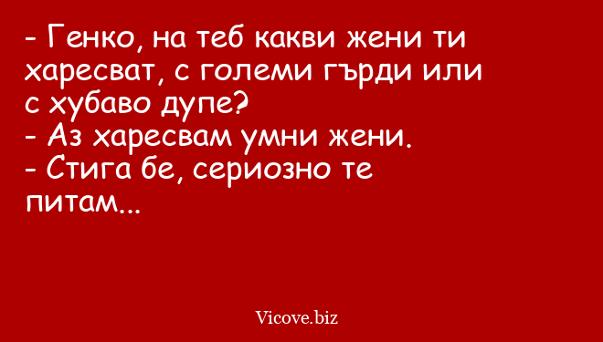 - Генко, на теб какви жени ти харесват, с големи гърди или с хубаво дупе?