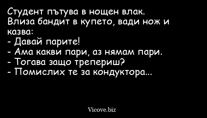 Студент пътува в нощен влак. Влиза бандит в купето, вади нож и казва: