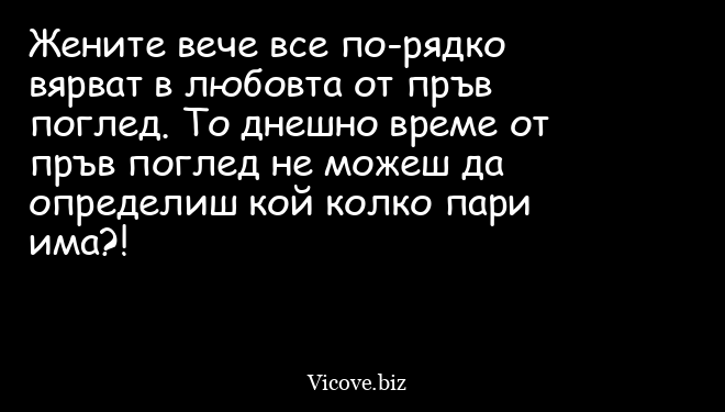Жените вече все по-рядко вярват в любовта от пръв поглед. То днешно време от пръв поглед не можеш да определиш кой колко пари има?!